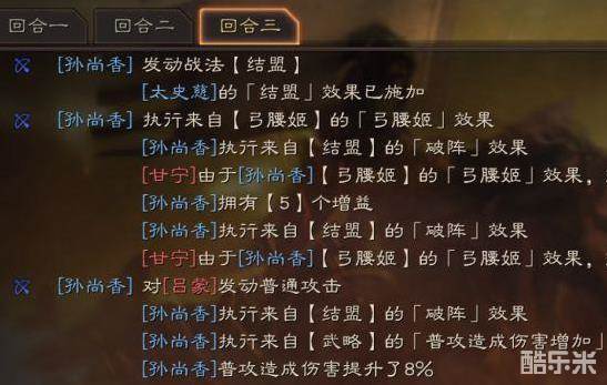 孙权主将优先各种BUFF,破阵连击先攻等在第三个回合就已经叠满。带上一骑当千,打你都是零防御的伤害。兵法见图。而第三个回合孙尚香也和孙权一样叠满5个BUFF了,伤害是杠杠的。太史慈就不用说了,一直是强攻永动机,神你一脸