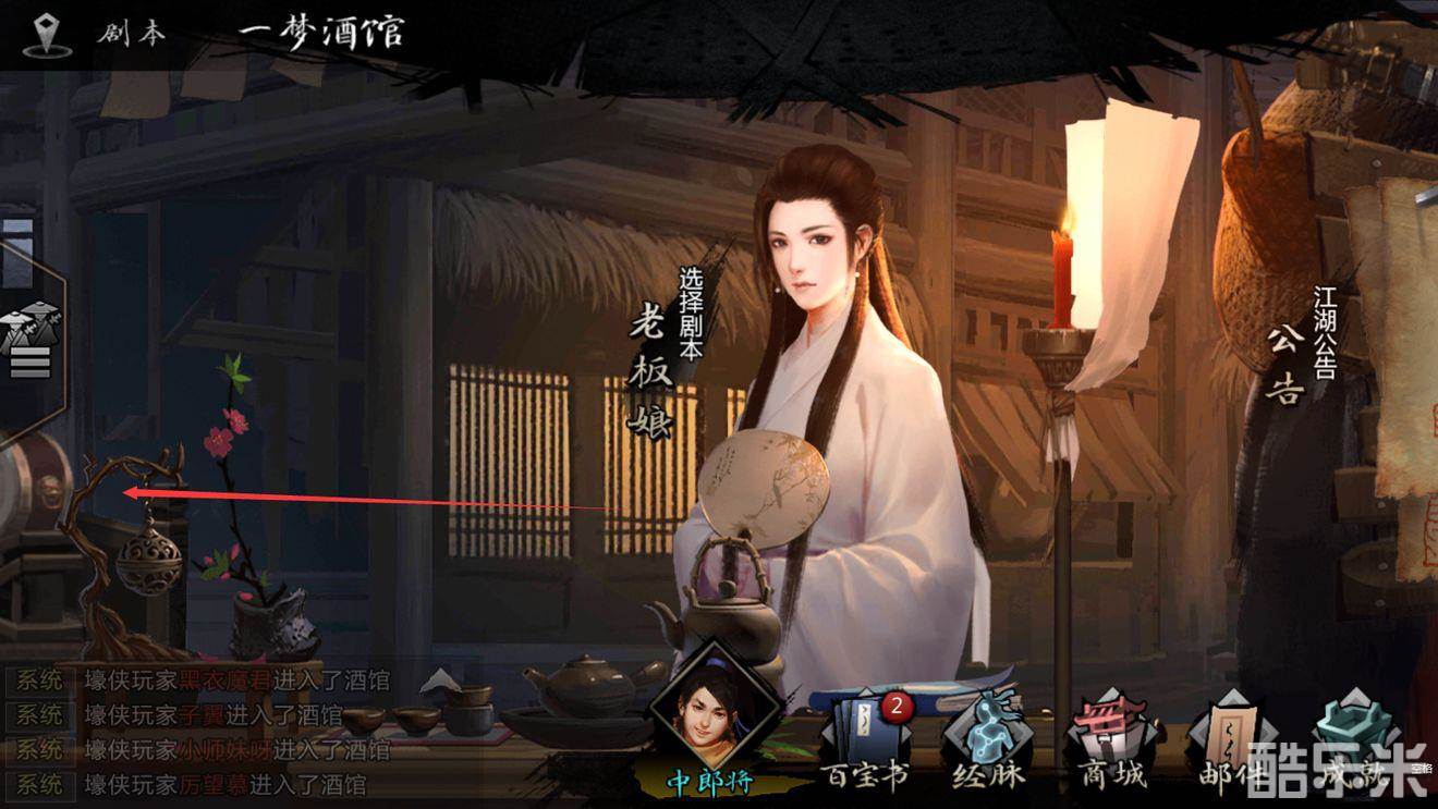 擂台赛入口位于酒馆界面老板娘的左侧,进入酒馆后,将屏幕向右滑动,即可看到擂台赛的入口,点击“擂台“字样即可进入擂台赛界面。