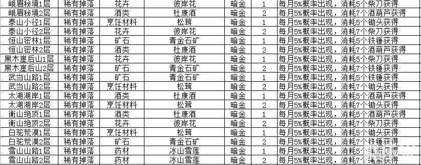 迷宫拾取这就是很方便了,在练级和做事件的过程中来收集材料,且每个迷宫都固定了材料种类,值得注意的是每个迷宫的刷新CD也是一个月;另外特别的材料还需要在迷宫中使用特定采集道具来采集,下表是部分特定采集材料与需要的物品列表: