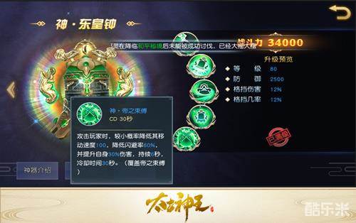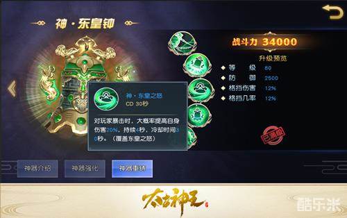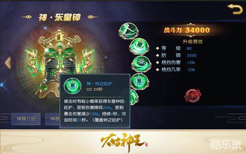 作为角色化神后才能开启的进阶任务,神器重铸后东皇钟的各项加成、技能效果都得到大幅提升。首先就是这件神器的控制能力,东皇钟的钟声直指人心,敲响之时对手的魂魄会受到极大冲击。“神·钟荡”会在攻击时以较大概率大幅降低目标移动速度,尤其适合近期刚上线的神域运宝玩法。