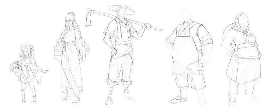 我们游戏作为一款开放式剧情庞大的武侠游戏,肯定有很多村民路人角色,所以春燕的小女孩形象,最初作为村民五人众之一,很早前就规划出来了草图。(看看哪个是李大娘哪个是阿刚。。。)