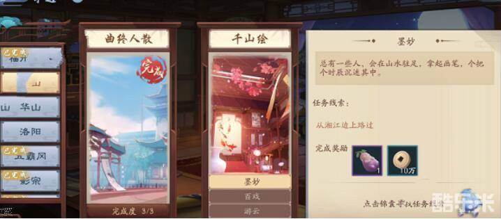 近期的更新完成之后本作又新增了大量的奇遇支线可供各位玩家探索触发方法,对于衡山这一地图场景的千山绘奇遇正如其中的绘字是一个与画画有关联的任务链。不过目前可能还有许多玩家并没有发现这一奇遇的正确达成方法。