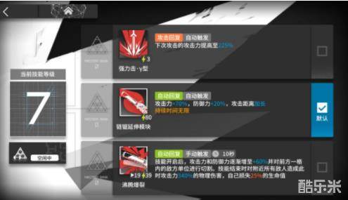 1技能为较常见的持续输出技能,0启动的优势便于空降,但空降的时间与位置对博士来说有一定的难度;前期压力较大的关卡中1技能便于对敌人的清理,搭配陈的天赋可以更有效的触发(几乎可以只A两下便触发一次)。这里仅取12次攻击对比,后续伤害差距会更明显。不过由于1技能较为普通,也没有什么不可替代性,所以并不推荐专精,7级即可。