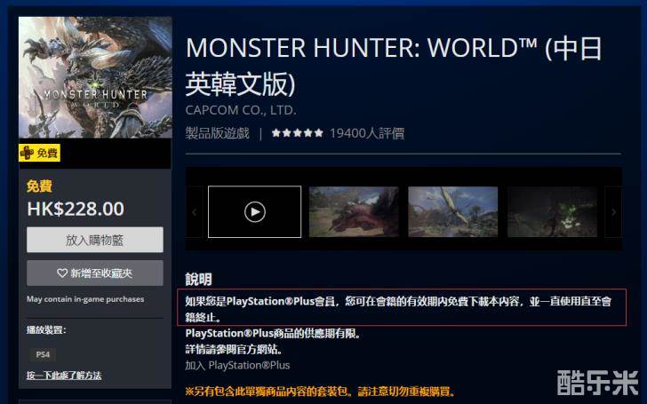 PlayStation商店显示“如果您是PlayStation Plus会员,您可在会籍的有效期内免费下载本内容,并一直使用至会籍终止”,目前《怪物猎人:世界》在港服PlayStation商店售价228港元。领取地址