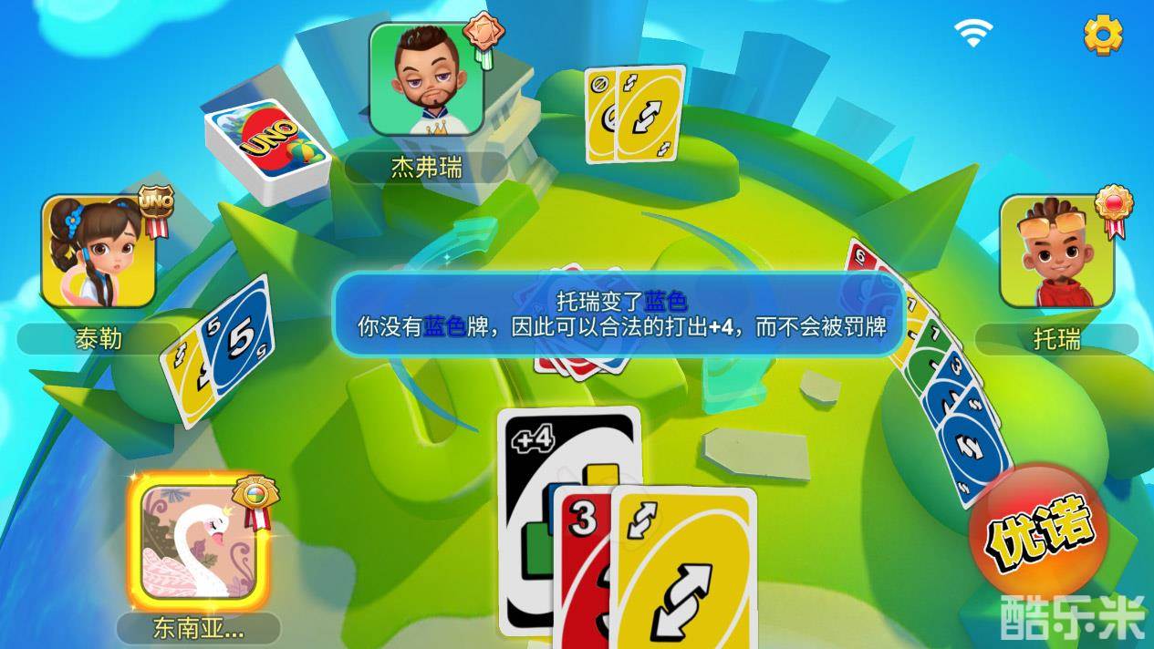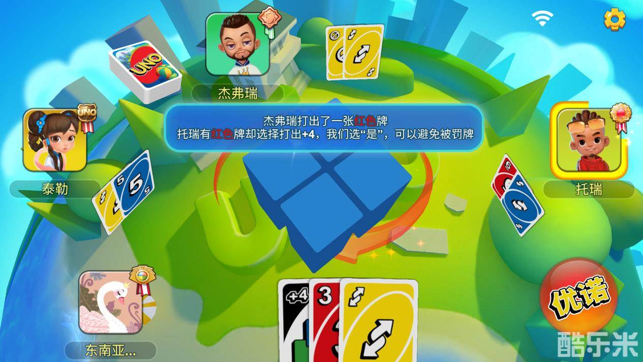 我们来一起看一下游戏内的新手教程之+4质疑规则。当我们的上家打出+4牌时,系统就会问我们,是否选择质疑。比如杰弗瑞打出一张红色牌,托瑞有红色却选择打出+4,并将牌局颜色转换为蓝色。