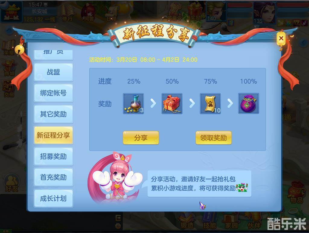 3月20日08:00至4月2日24:00,30级以上玩家可以通过“奖励”按钮进入“新征程分享”活动页面,选择将链接分享给微信好友或发送至朋友圈,邀请好友完成互动小游戏即有机会获得华为Mate30、平板等实物好礼,当小游戏达成不同进度条件后,还可在游戏内解锁对应阶段奖励。