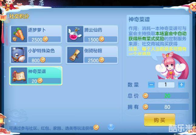 新道具“神奇菜谱”全服上线后,玩家们可以在社交商城中花费20社交积分购买,宴会期间,使用“神奇菜谱”即可与宴会主持换取宴会定制服务,开启定制服务后,本场宴会中将自动获得所有菜式的全额奖励。
