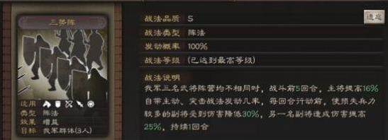1、三势阵属于阵法,不能和锋矢阵、八门金锁阵同时出现在一支队伍中。2、需要队伍中三名武将处于不同阵营,提高主将自带主动战法、突击战法发动率;每回合行动前,损失兵力较多的副将获得减伤,另一名副将伤害提高。需要注意的是,这里的“每回合行动前”是指携带三势阵的副将每回合行动前,因此携带三势阵的副将速度最好快过另一名副将。