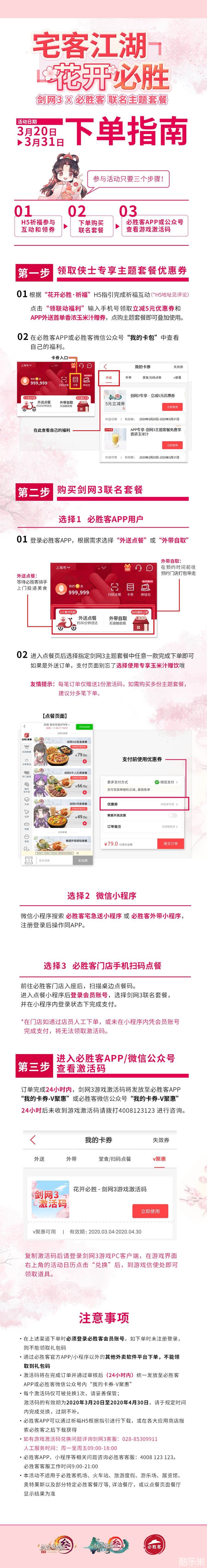 “宅客江湖、花开必胜!”《剑网3》携手必胜客推出定制 “宅客江湖”主题套餐,并于即日(3月20日)起至3月31日在全国正式上线,考虑到侠士们的用餐安全,本次主题套餐还将贴心的支持宅急送,让侠士足不出户也能够享受这份来自江湖的特色美味!“宅客江湖”主题套餐除了价格更实惠外,侠士于活动期间购买主题套餐还将100%获得游戏好礼,永久珍稀挂件“舞歌千城”、“夜幕星河”、烟花“真诚之心”等诸多惊喜随机掉落!更有定制H5“花开必胜·祈福”、踩楼点单送好礼、专属微博及剑网3推栏APP活动等你来参与!