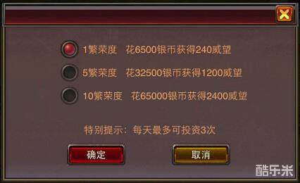 投资城市也是可以获得一定威望的,每天可以有3次投资机会,在主城界面“世界”进入,点击点光的,亮光的城市则是你所在的城市,这时你就可以进行投资了,投资的繁荣度不同获得的威望数量也不同。