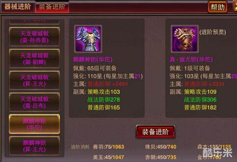 和战守器械的进阶规则类似。装备进阶后,强化等级将会将会根据该装备当前强化等级所花的银币,折算为进阶后同等银币所能达到的强化等级,洗炼的副属性条数及品质也会得到完整保留,对应的数值将在进阶后自动按照比例获得提升,不用重新洗炼。