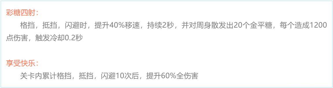 格挡,抵挡,闪避时,提升40%移速,持续2秒,并对周身散发出20个金平糖,每个造成1200点伤害,触发冷却0.2秒