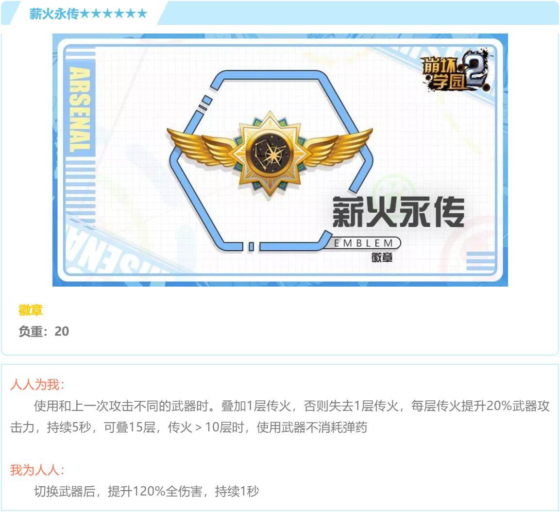 《崩坏学园2》中的徽章「薪火永传」非常强力,但需要合理的搭配来配合,有的小伙伴不了解他的强度与优势在哪里,具体内容就来看看下面分析吧。