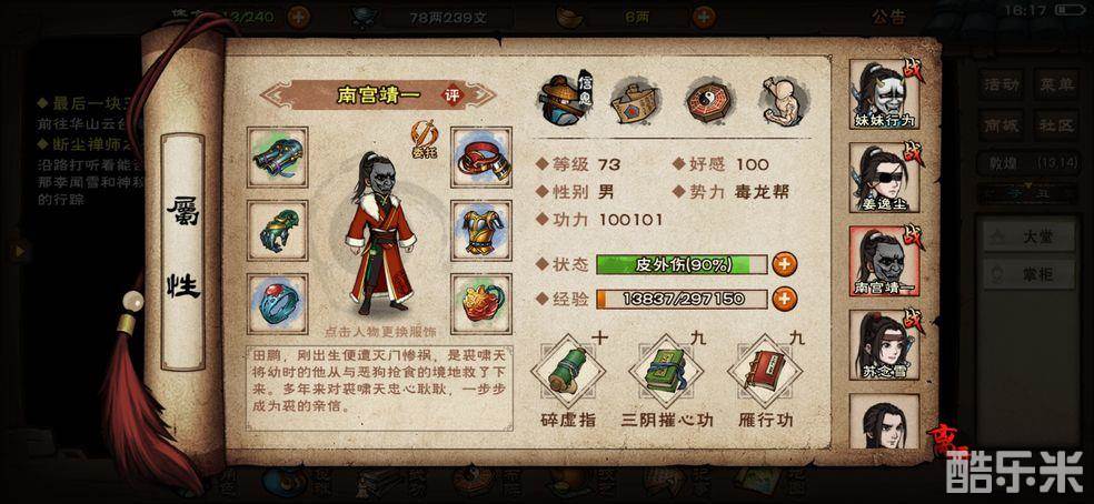 首先我们来看看加点,加点分为前排和后排,前排直接选择臂力、根骨、内息,加点为1、1、1就可以了,后排需要增加臂力、身法、内息,加点方法同样为1、1、1。现在我们来看看武学搭配,玩家们直接前期选择八卦或流云搭配吐纳效果就很好了。