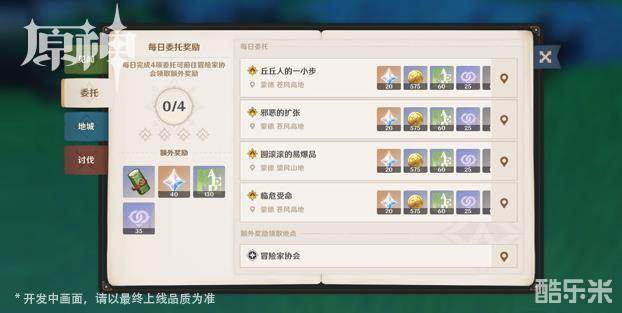 这个日常任务系统并不是每天都完全一样的哦,而是有一个任务的池子,里面有预设好的很多日常任务,每天随机刷新4个,当冒险家都完成以后就可以去主城冒险协会领取奖励了。