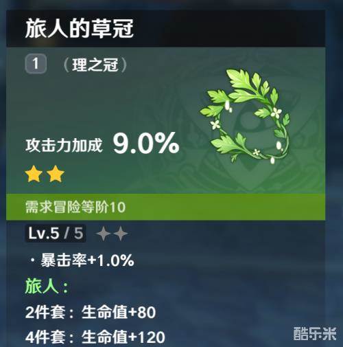旅人的草冠:跟沙漏一样的效果,直接就是9%的加成,性价比同样爆炸,区别在于装备的位置不同,像是这样的装备还有不少,我只是举例告诉大家,方便大家有个参考和对照。