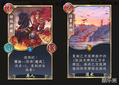 【踏焰骠骑】体现了新关键词“借法”,即“本回合内你使用的上一张牌是法术牌”。在火系快攻中可以用上它,和霹雳火、乱剑等容易配合。借法对使用卡牌的顺序提出了更高的要求。【往事如烟】也是一张天卡,它为依赖关键法术的套路提供了更灵活的选择,通常带1张即可。