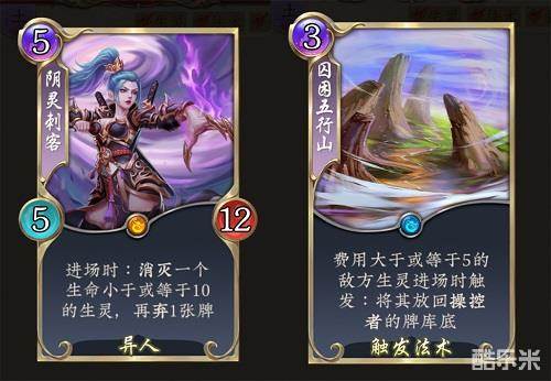【阴灵刺客】是一张天卡,它的弃牌效果通常是负面的,但在特定套路中可以利用起来。【囚困五行山】在部分套路中可以加,关键时刻防不胜防。理论上3费可以干掉任意高费生灵,缺点就是不能阻止进场能力。