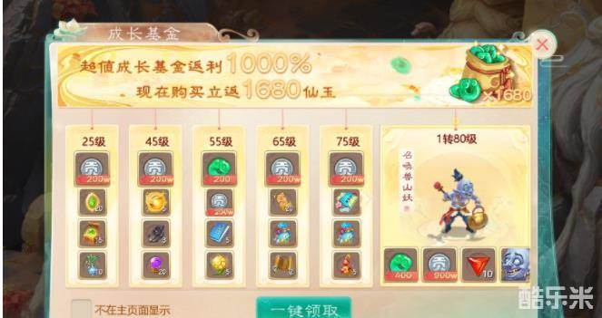 在新服开启后,玩家可以花费1680仙玉购买【成长基金】,购买后立返1680仙玉,并且玩家只要角色达到指定等级都可以领取相应的好礼,从银两、帮贡、宝石到召唤兽、技能书应有尽有,礼包总返利预估达到1000%,真正伴随着大家一路成长!
