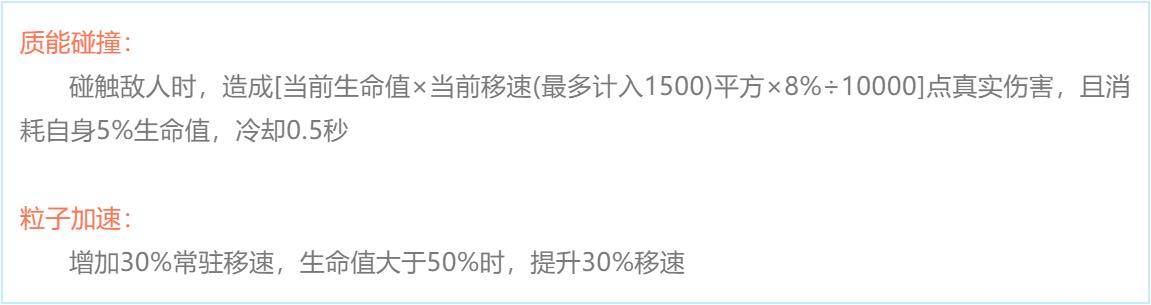 碰触敌人时,造成[当前生命值×当前移速(最多计入1500)平方×8%÷10000]点真实伤害,且消耗自身5%生命值,冷却0.5秒