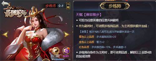 1、步练师:特殊活动产出,可担当任意英雄的任意兵种副将