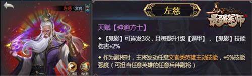 7、左慈:二合后充值活动获取,可担当任意英雄的任意兵种副将;增加文官类英雄主动技能强度,基本就给文官充当副将了,如:诸葛亮,郭嘉等;