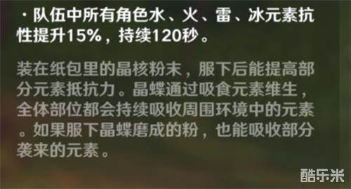 服用后,队伍中的所有角色水、火、雷、冰元素抗性提升15%,持续时间120秒。