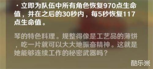通过该食物,团队中的所有角色都将立刻回复970点生命值,并在接下来的30秒时间里每隔5秒回复117点,共计999点。
