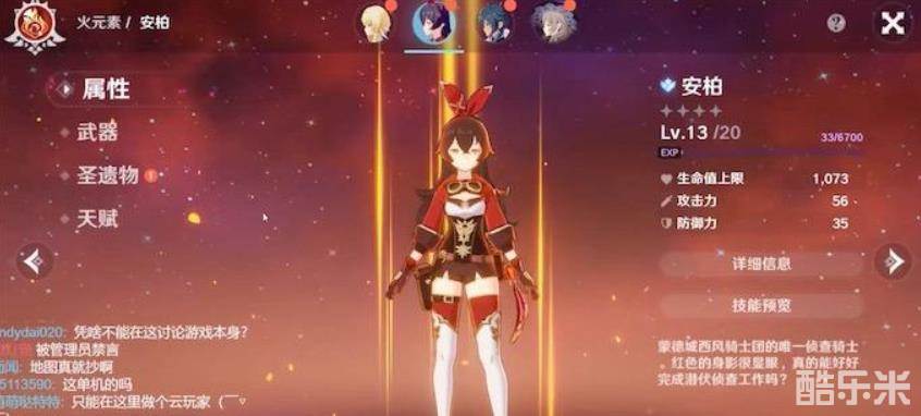 安柏是个火元素角色,定位也非常明显刺客类型定位,在很多高难度章节中安柏可以帮助玩家去侦查情报,躲避一些角色的追踪。13级就已经有1073的生命值了,生存能力很高,能完美应对前面几个章节挑战。