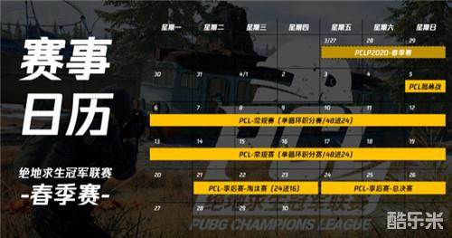 2020年,代表中国大陆赛区的PCL将更加重视同全球性赛事的衔接,计划一年举办春、夏、秋三季PCL比赛,为PGS全球系列赛选拔最强PCL战队。为了全力做好防疫工作,为保障广大绝地求生电竞爱好者、选手和赛事工作人员的身体健康,2020绝地求生冠军联赛(PCL)春季赛拟定于4月5日通过线上赛形式开启。每季PCL为期三周,包含两周常规赛和一周季后赛。常规赛的48支战队将被划分为3个赛区、共6个小组,进行为期15日的单循环积分赛。常规赛积分排名前24的队伍将晋级季后赛,其余将被当季联赛淘汰。被淘汰的24支战队中,积分垫底的6支队伍,将落入下赛季PCL升降级赛。