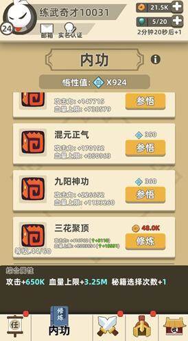 前期的悟性值点生命和增加攻击力加成高的秘籍是比较好的,如果你就差那么一点点就能通过下一关主线副本,我们可以把悟性值放在下关的内功中,这个属性加成还是非常不错的。