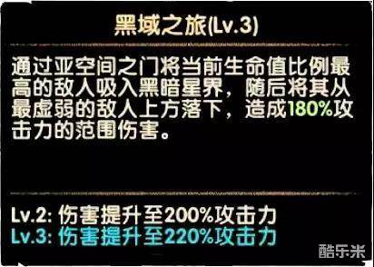 黑域之旅:这是一个控制技能,可以把目标吸入到黑暗星界中去然后掉落造成伤害并造成晕眩的效果,配合被动的话可以起到不错的控制时间。
