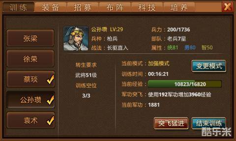 如果你的官职足够高,可以招第五个将了(如果还不够就投资、攻打敌对国家),一过了袁术,就赶紧迁移到新地区,然后升50级主城、50级军机处,把某个阵法升到10级,然后就可以用该阵法上5个将吧,5个将打人家四个肯定是划算很多的。