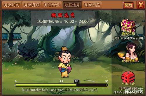 微服选秀这个活动是每天的10点到24点开放,每天的5点返回起点,10点和21点额外增加5点行动力。玩家有10点行动力来掷骰子行动,掷到几点会移动几格,一共50格算通过一关,途中玩家会随机巡得1-2星的美女,行动力加1还有可能什么也没有巡的。所以玩家需要看自己的人品拉。不想浪费时间或者想直接获得高星级美女的玩家可以直接通过金币选秀来随机抽取2-4和2-5星的美女。每天第一次通关的玩家可以选择用银币或者金币选取不同的礼箱,来获取不同的奖励,有仕女图,美女等。