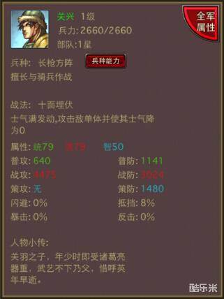 关兴即是关羽之子,那么作用肯定是不容小觑的,想象一下一个满士气的战法将被一下打出0士气的普攻将,这是有多么地变态呢,给力地非常!如果你喜欢他,不妨招募他,我相信关兴一定不会让你失望的!