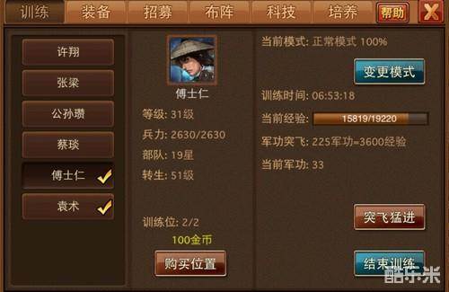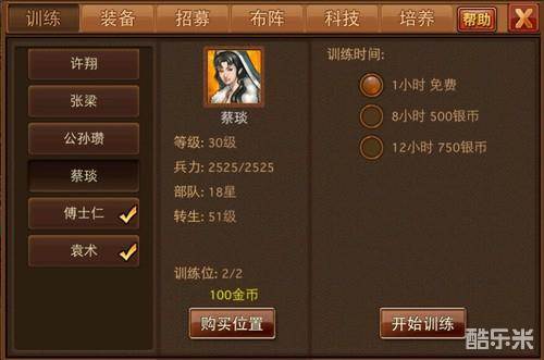 武将需要训练才能升级,选择一个武将之后,有三种训练可供选择,分别是免费1小时,8小时500银币和12小时750银币。开始训练之后玩家可以选择使用军功突飞猛进让武将快速获得经验,玩家需要升级别的武将时,可以选择结束训练,然后再训练别的武将。在训练武将时可以选择加强模式,花费2金币可以获得120%的经验加成。