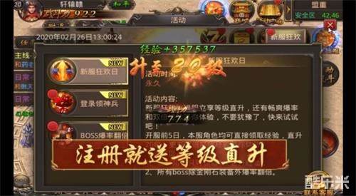 登录即送经验大礼包,进服立享20级等级直升大福利,进服即可畅快PK,畅享激情。