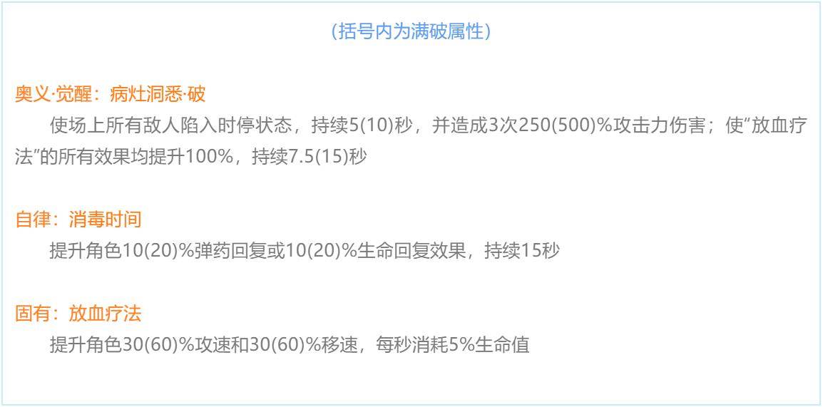 使场上所有敌人陷入时停状态,持续5(10)秒,并造成3次250(500)%攻击力伤害;使“放血疗法”的所有效果均提升100%,持续7.5(15)秒
