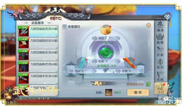 少侠们的各式装备可以伴随着等级提升进行升级,当装备达到涅槃70级后即可自动解锁雕琢系统。目前可以进行雕琢的装备分为武器、帽子、上衣、下装、护手、靴子六种。