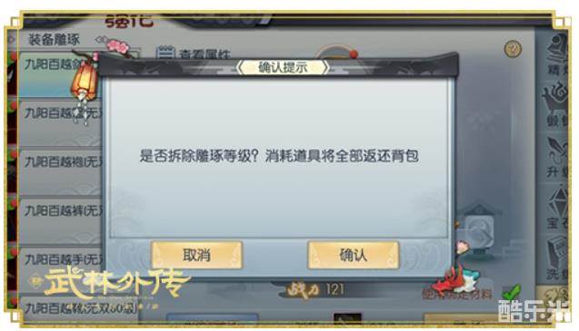 若当装备需要进行传承时,雕琢属性将保留在原装备上,少侠可以手动拆除原装备的雕琢孔位;或是出售了带有雕琢属性的装备,都将全额返还已经消耗的道具,不需担心新增的额外成本哦~