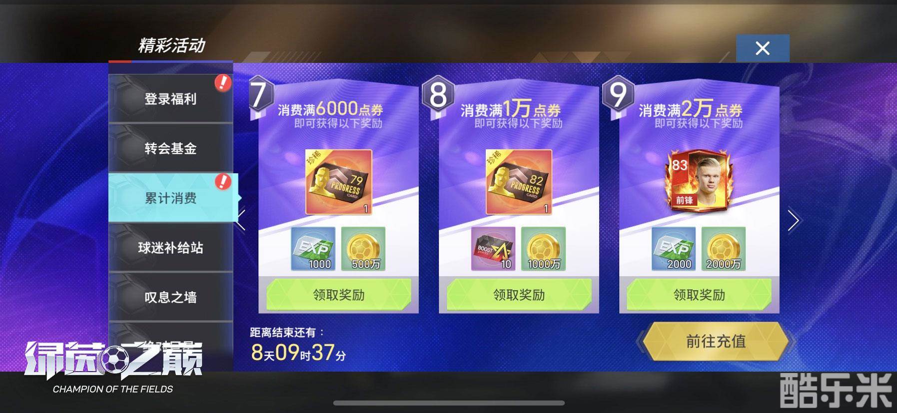 “累计消费”活动。累积消费达到一定金额,除了大量钻石金币与突破点数外,更有高级球探券、巨星特训卡礼包等你领取。而一直备受关注的火热状态卡哈兰德,也将在本次活动中正式登陆《绿茵之巅》,参与累积消费活动,即有机会将它带回自己阵中!