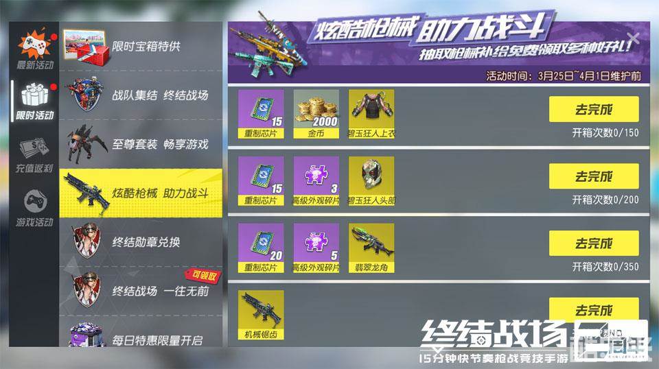 3月25日到4月1日期间,《终结战场》将开启至尊预热活动,玩家通过抽取枪械补给提前锁定“暗蛛潜行者”预装礼包以及其他游戏内实用道具。
