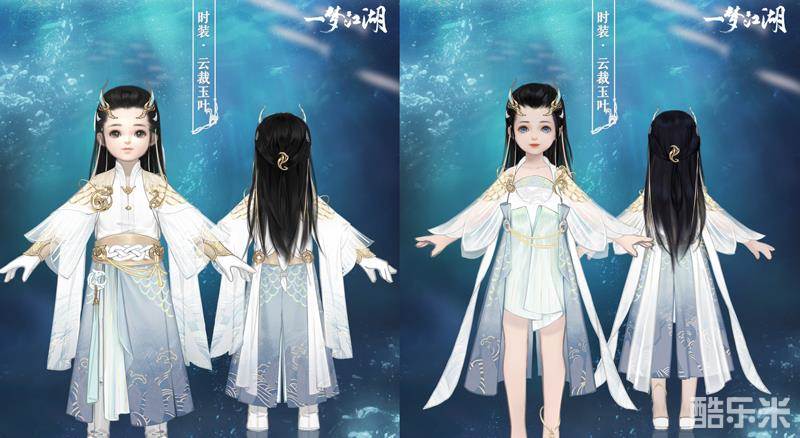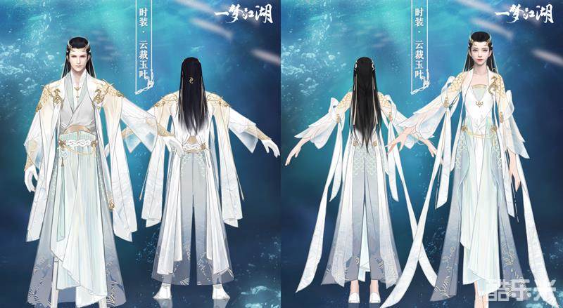 这套“云裁玉叶”时装,男款飘逸潇洒,女款柔美多情,虽然我们不曾见过龙人的模样,却不妨在江湖中穿上这套时装,当一回多情的龙子/龙女。