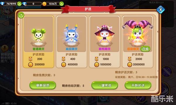 玩家每天有3次护送的机会,而目标则是把精灵护送到精灵家园的使者处。进入护送专用地图后与NPC对话,即可开始护送。护送的精灵按照稀有度分为四种,玩家可以通过刷新品质提升精灵的稀有度,从而获得更多的奖励。有钱任性的话,也可以消耗100钻一键召唤极品精灵,2000的荣誉奖励十分诱人。