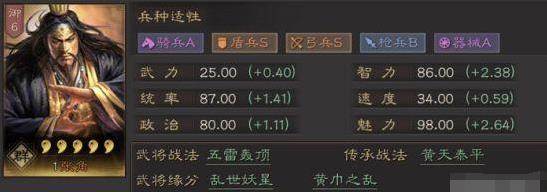张角的面板几乎是一个标准的“短腿法师”面板:几乎没有的武力值跟速度,加上中等统率,高智力。这样的属性也注定了张角要想发挥最大的能量,就要走高续航的套路,后手爆发型的武将,永远要强调先生存后输出。