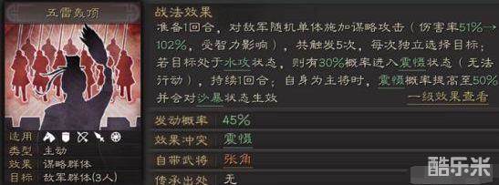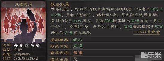 由于非主将时,震慑仅30%几率并只对水攻生效,鉴于目前游戏的水攻战法极少,仅有于吉一个稳定的水攻来源,及沉沙决水这个需准备的战法。所以推荐张角主将,这样就有50%的震慑概率,并且对沙暴生效。可施加沙暴效果的战法就多了,诸如妖术、风声鹤唳等都是。