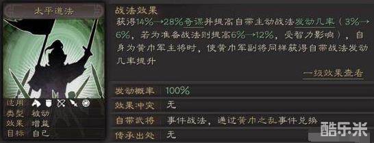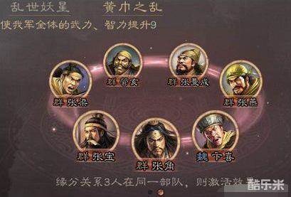 黄巾之乱这个缘分,虽然比不上乱世妖星,但S2的事件战法:太平道法的出现,让黄巾队也有了可玩性。对于有多个张角,但没有其他搭配武将的朋友,依靠张角+太平道法,配合四星黄巾武将,也能有强度不错的黄巾队。