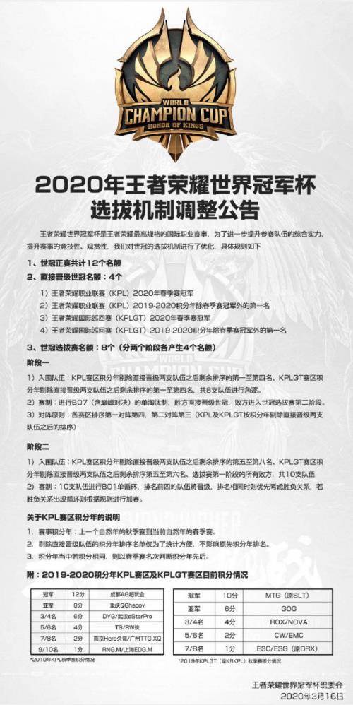 同时联盟也对世界冠军杯参赛名额选定方面做出了重大调整,在此之前,世界冠军杯的名额产生于两个方面,其一是KPL和KPLGT各自春季赛的冠军和亚军,剩余名额由两大联赛除冠亚军之外的其他队伍进行选拔赛。而新赛制将引入积分年制度,让春季赛发挥不佳的队伍,依旧能够以排名积分,获得参加选拔赛的机会。 积分赛制是国际体育赛事普遍使用的选拔制度,随着KPLGT的赛制逐渐成熟也吸引了越来越多有天赋的国内选手前来追梦。