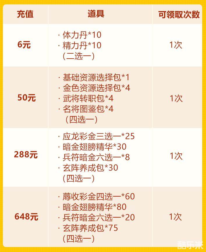 少年们单笔充值指定金额,即可得到蓐收彩金四选一、暗金翅膀精华、兵符暗金六选一、玄阵养成包等珍稀道具!并且可以和欢庆佳节中的充值活动叠加,少年们千万不要错过哟~