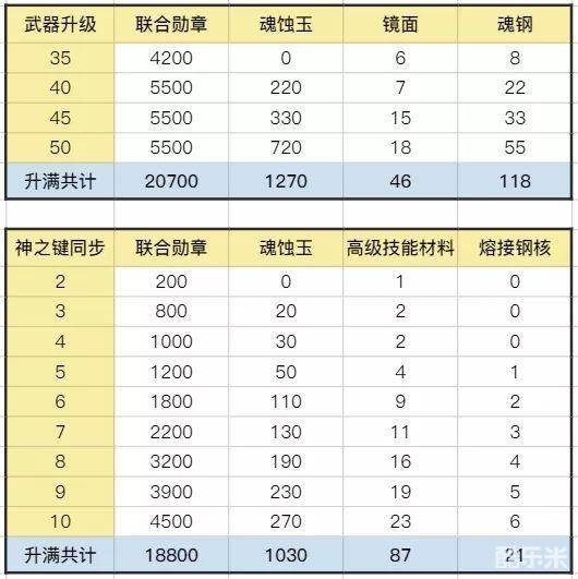 神之键升级材料在联机材料统一后作出了改版,具体升级所需材料如下表(均指肝物神之键):